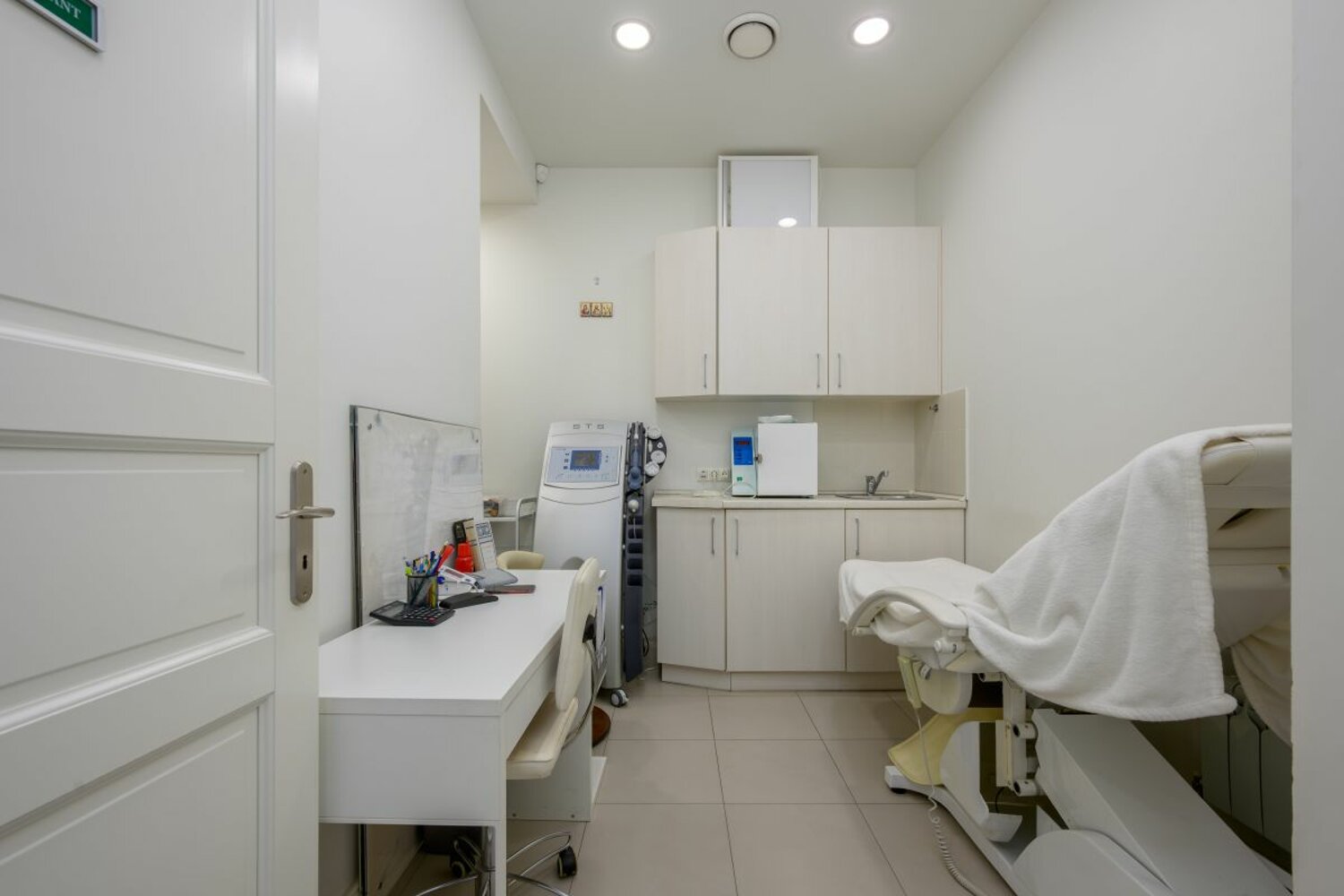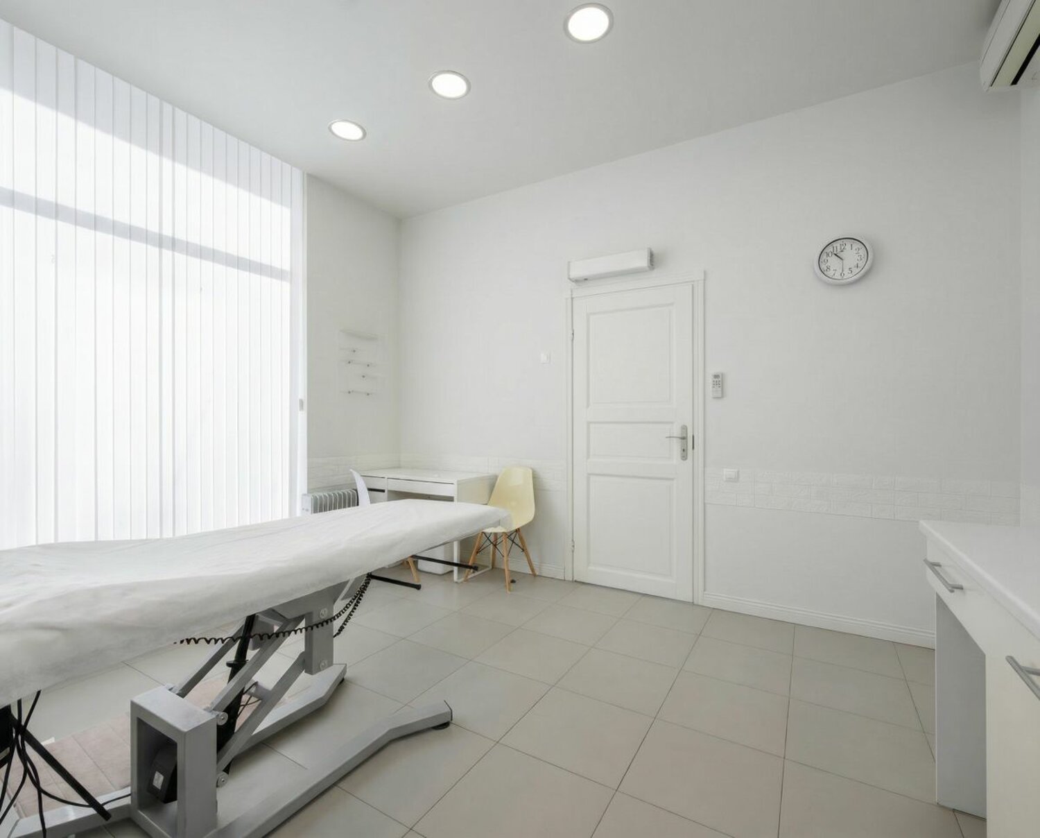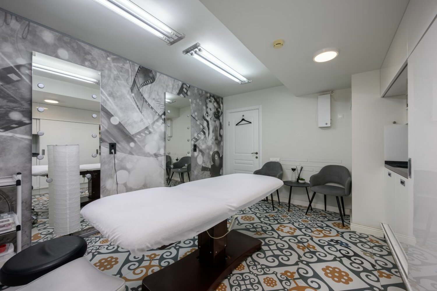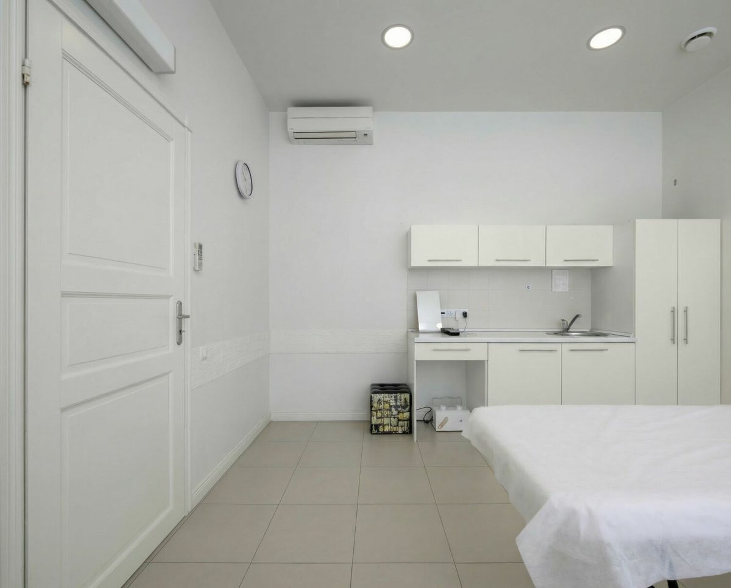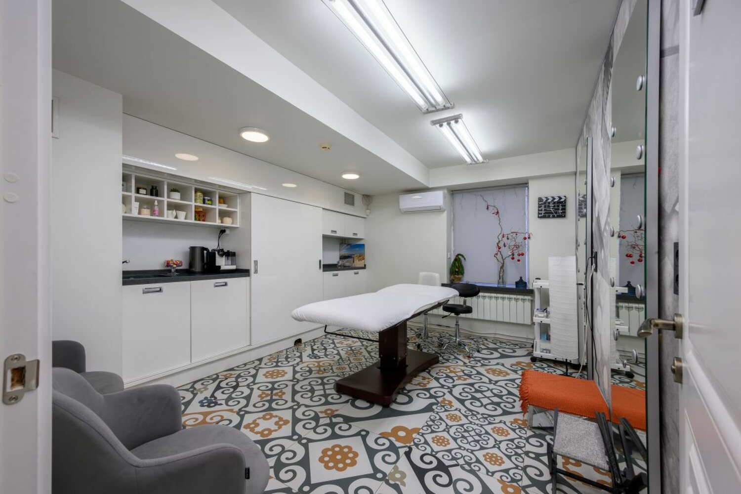 Планировка: 6 кабинетов (в каждом — мокрая точка, один кабинет с душевой), 2 санузла, ресепшен, помещение для персонала с кухней и системой хранения.