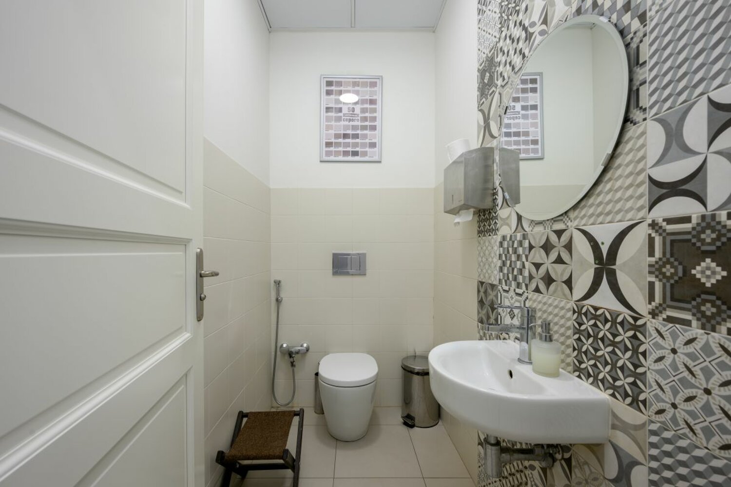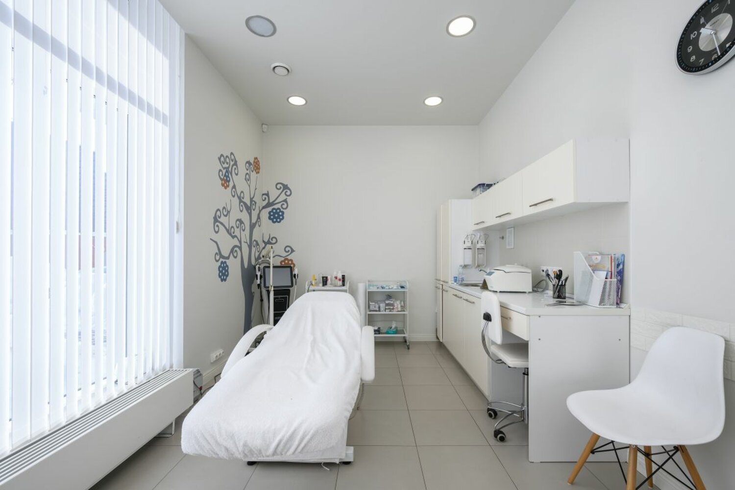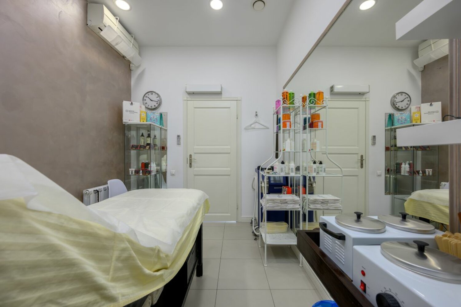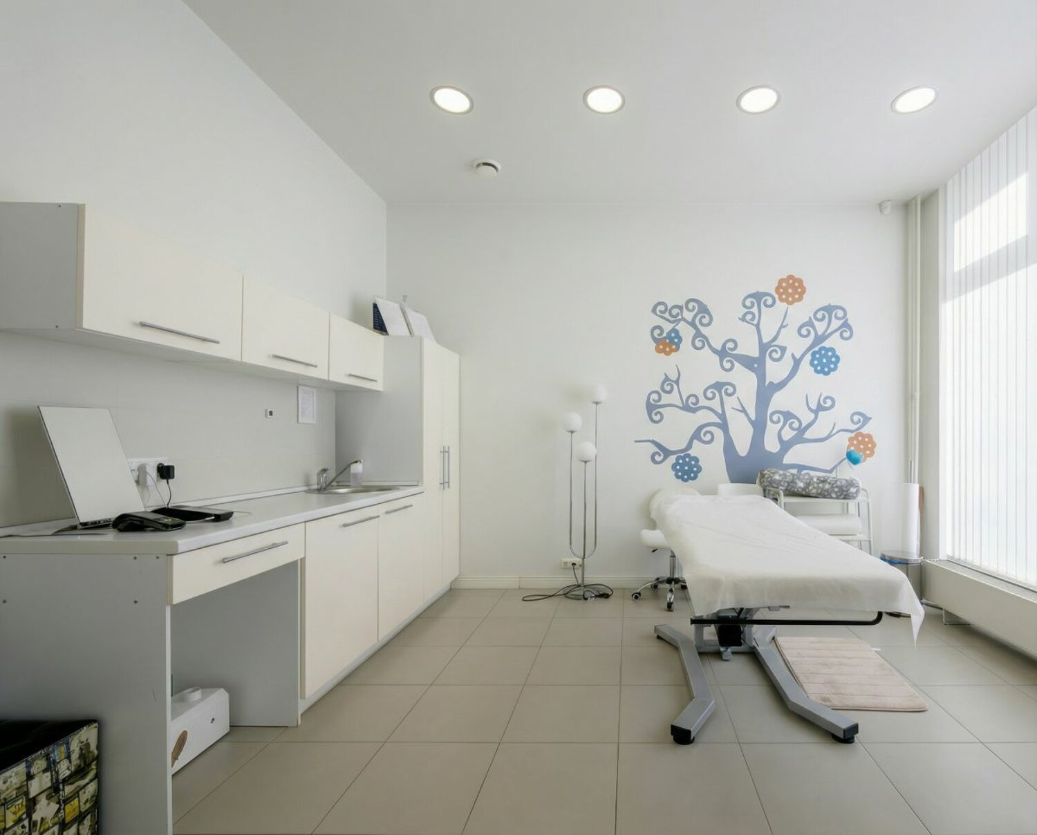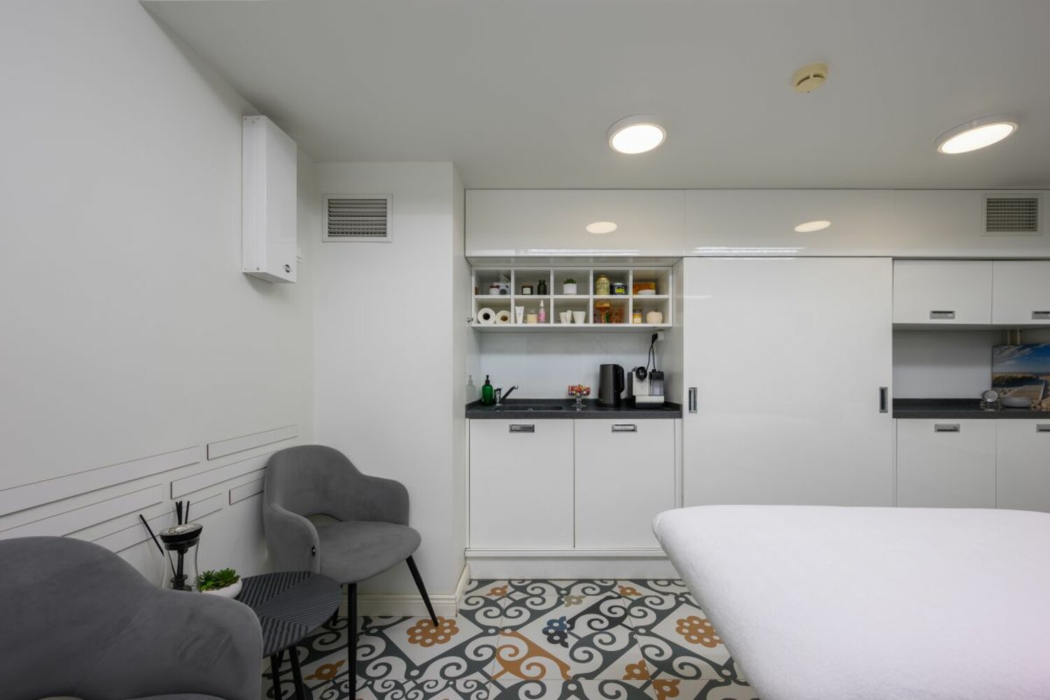 Планировка: 6 кабинетов (в каждом — мокрая точка, один кабинет с душевой), 2 санузла, ресепшен, помещение для персонала с кухней и системой хранения.