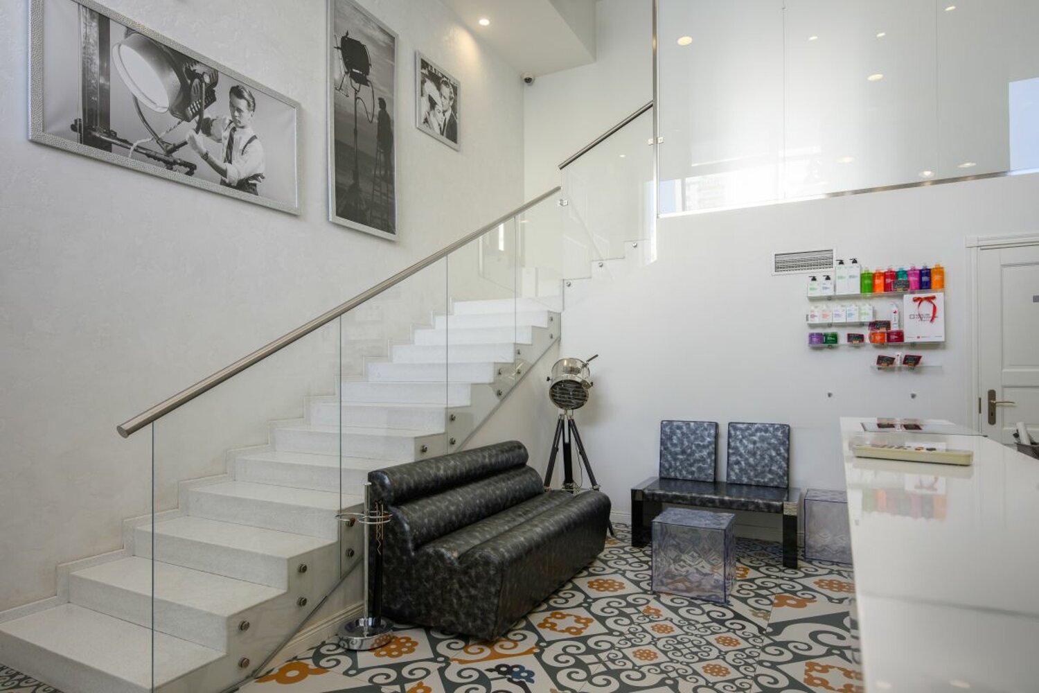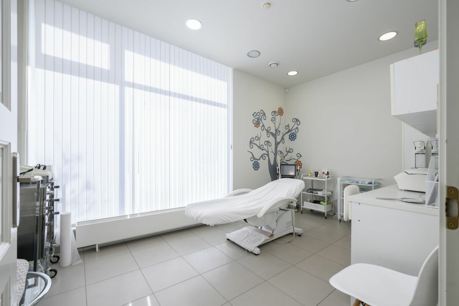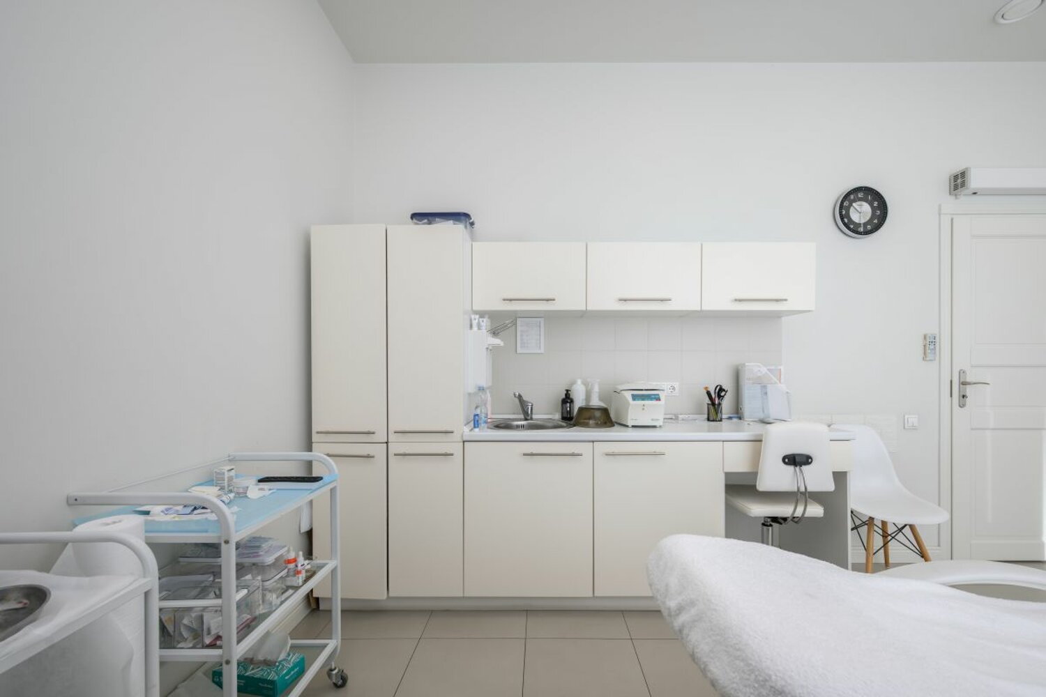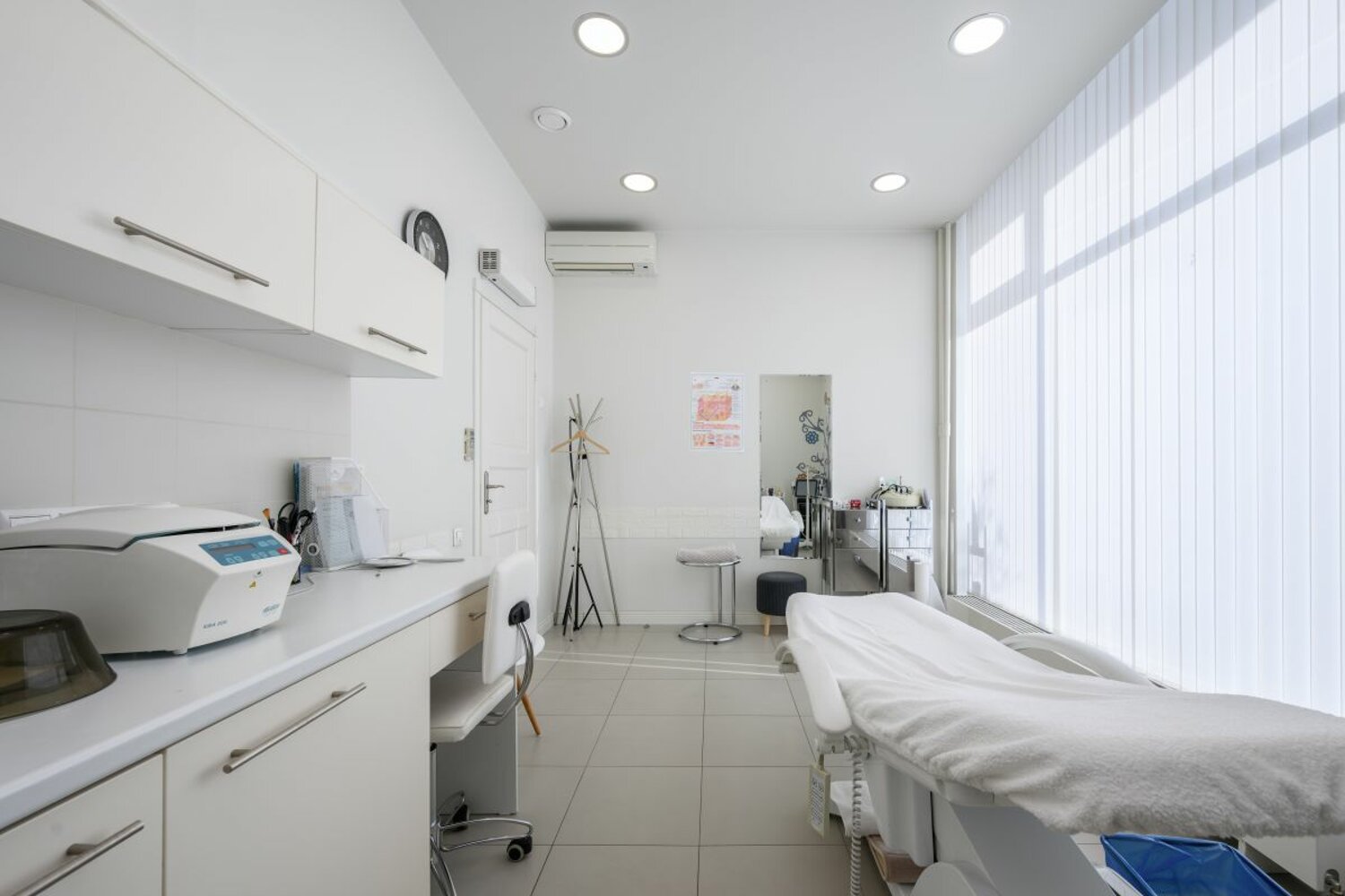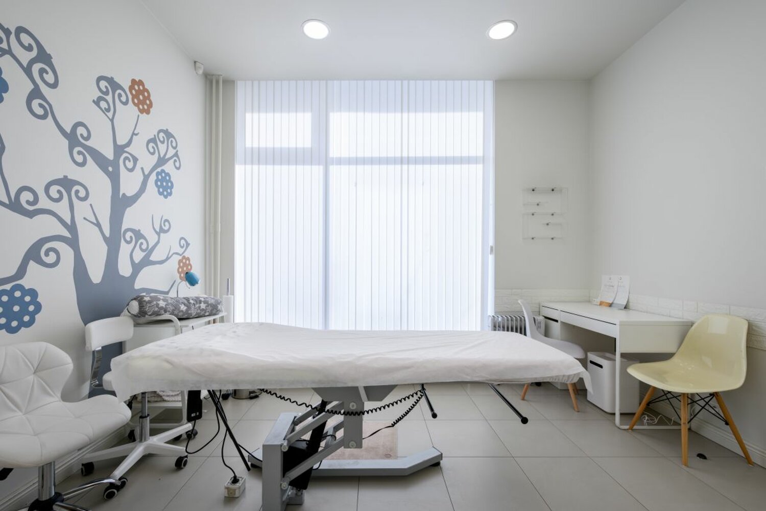 Планировка: 6 кабинетов (в каждом — мокрая точка, один кабинет с душевой), 2 санузла, ресепшен, помещение для персонала с кухней и системой хранения.