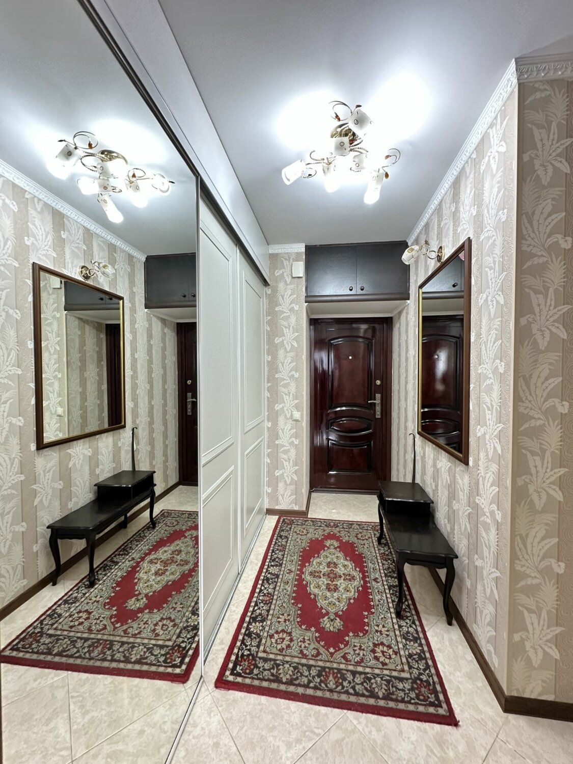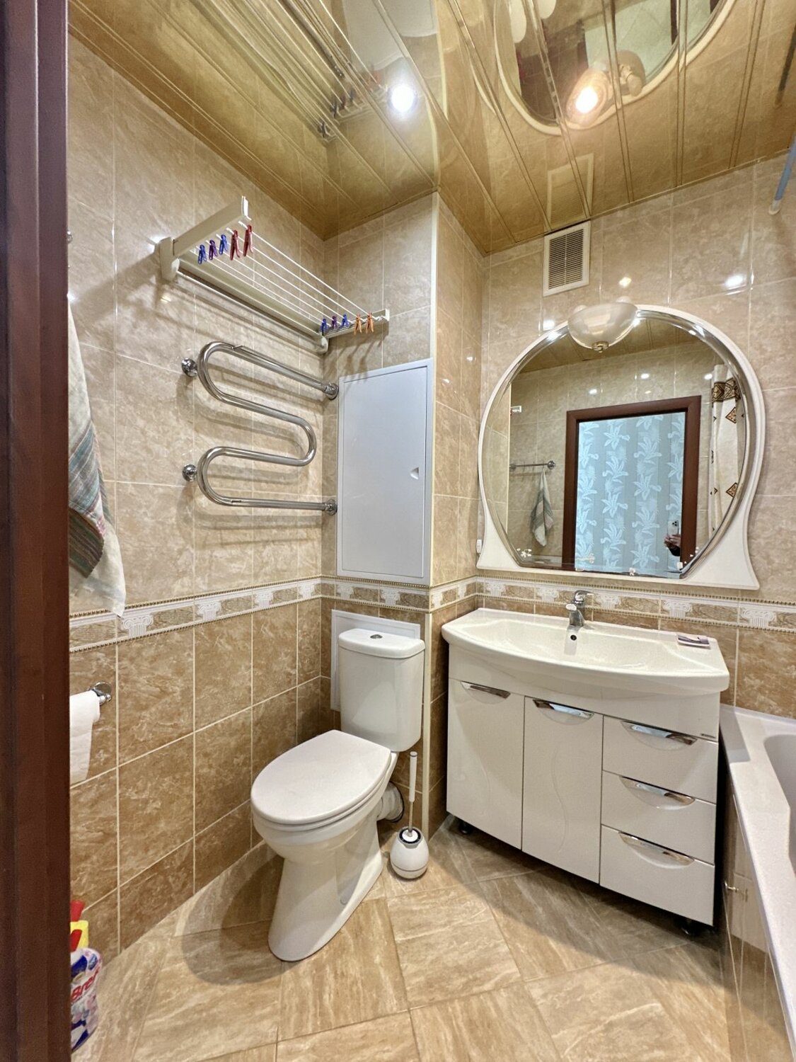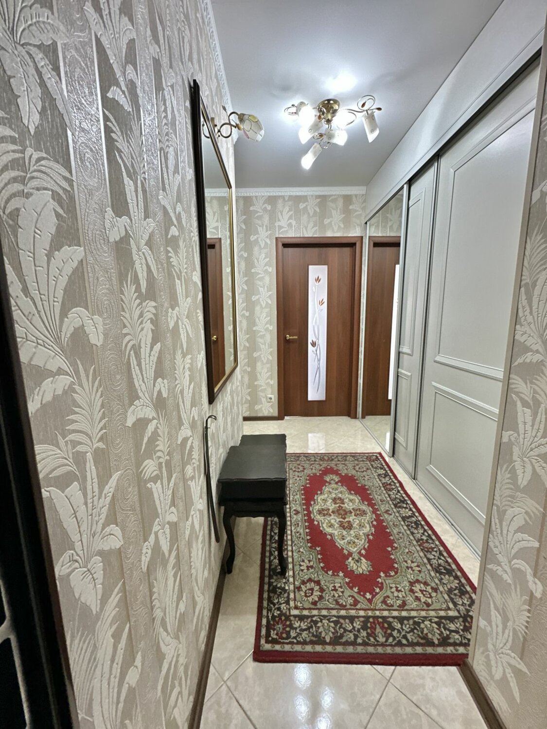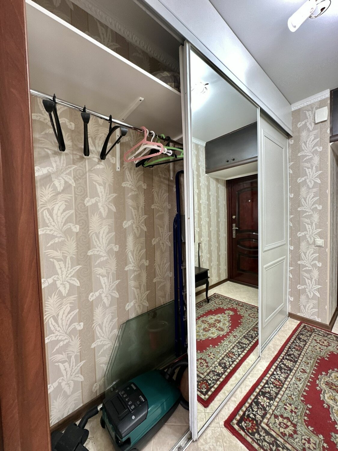 В коридоре большой встроенный шкаф зеркальный. Ламинат. Сан узел совмещен, в плитке. Стеклопакеты.