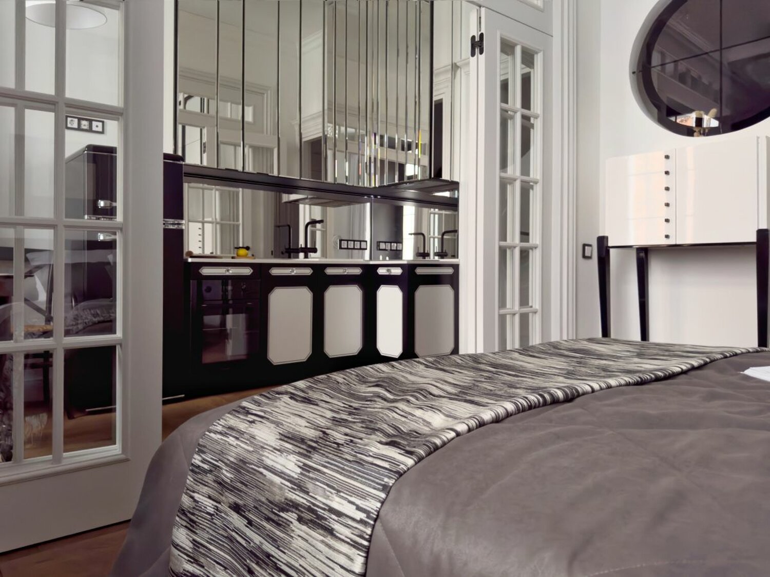 Продуманная организация пространства создаёт идеальные условия для жизни. В квартире современная кухня со всей необходимой техникой и зоной для приёма пищи. Просторная спальня оснащена вместительной системой хранения. Дополнительно предусмотрены два санузла. Высокие потолки и большие окна наполняют помещение естественным светом. Зеркальные и стеклянные детали визуально расширяют пространство. Окна выходят во двор, что гарантирует тишину и уединение.