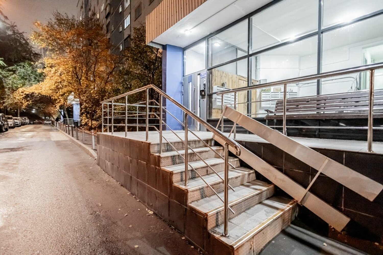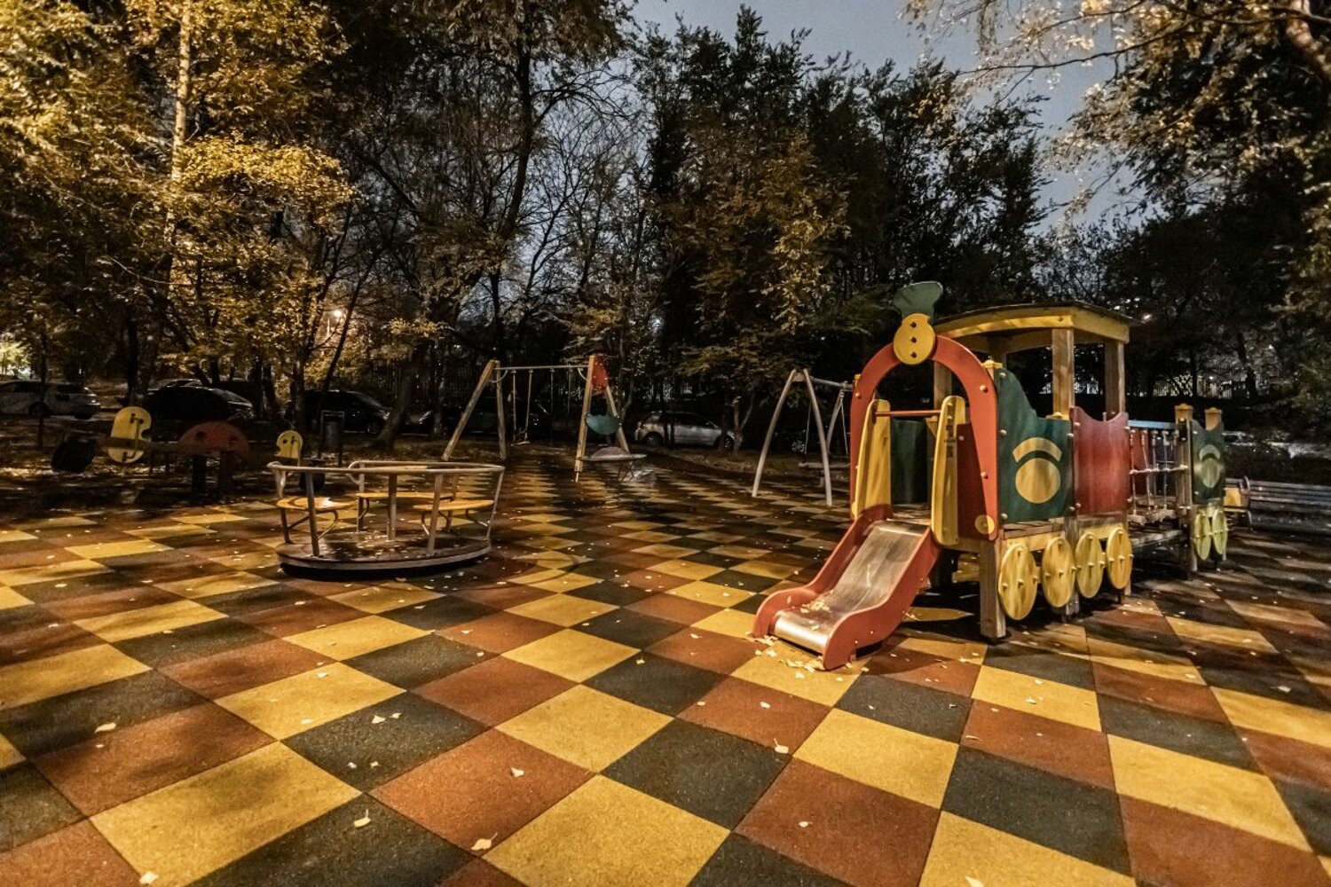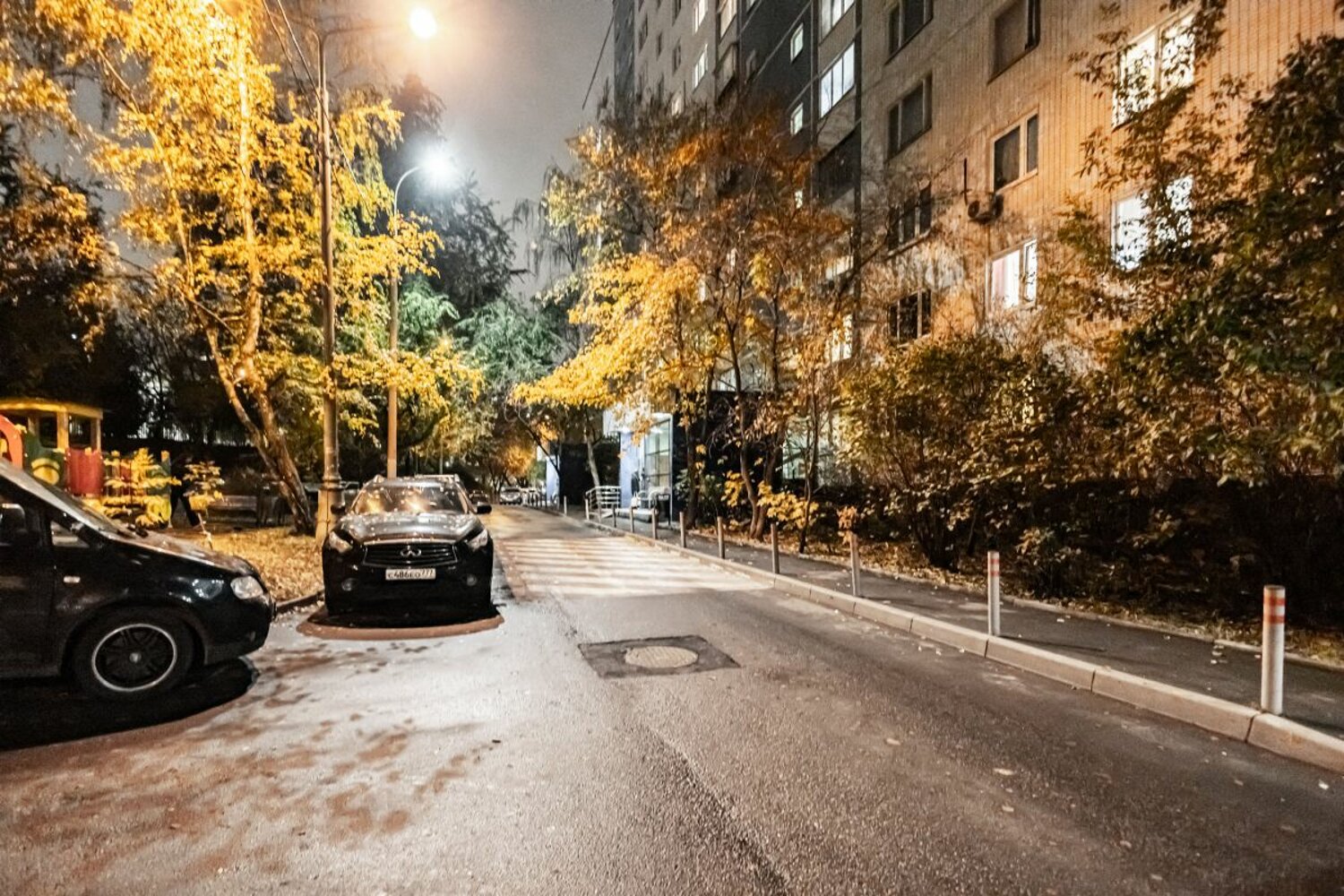 Во дворе современная детская площадка и места для парковки.