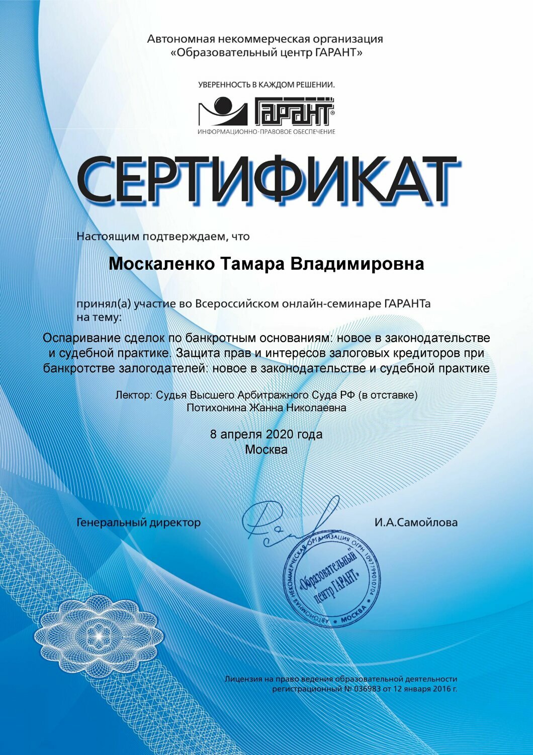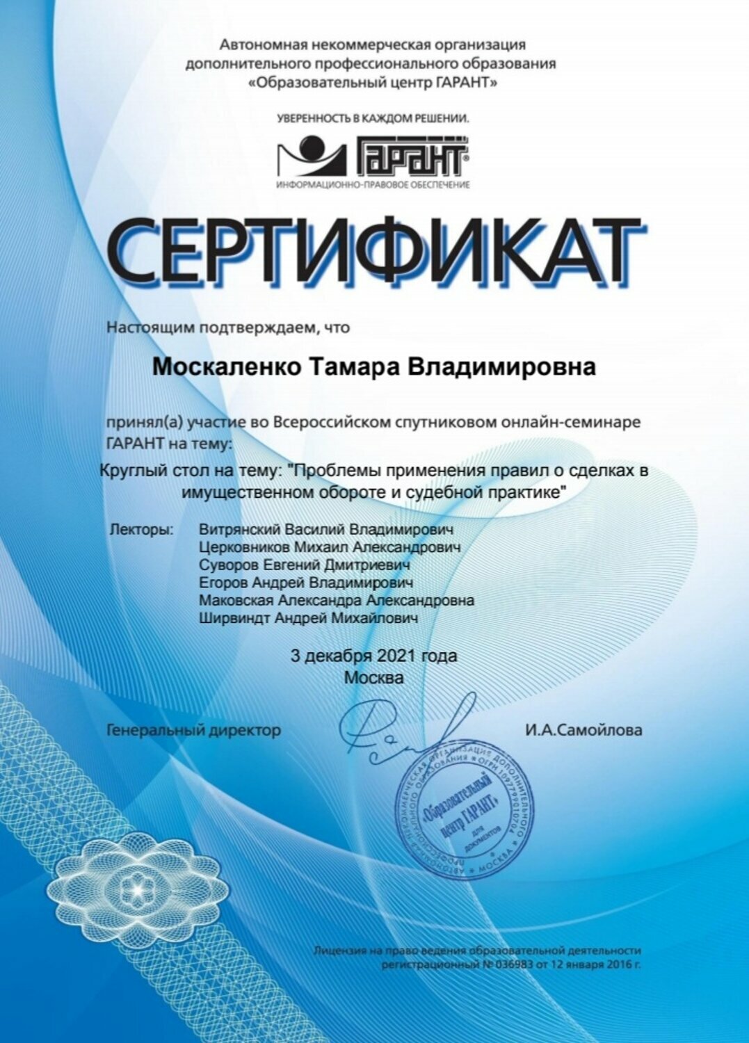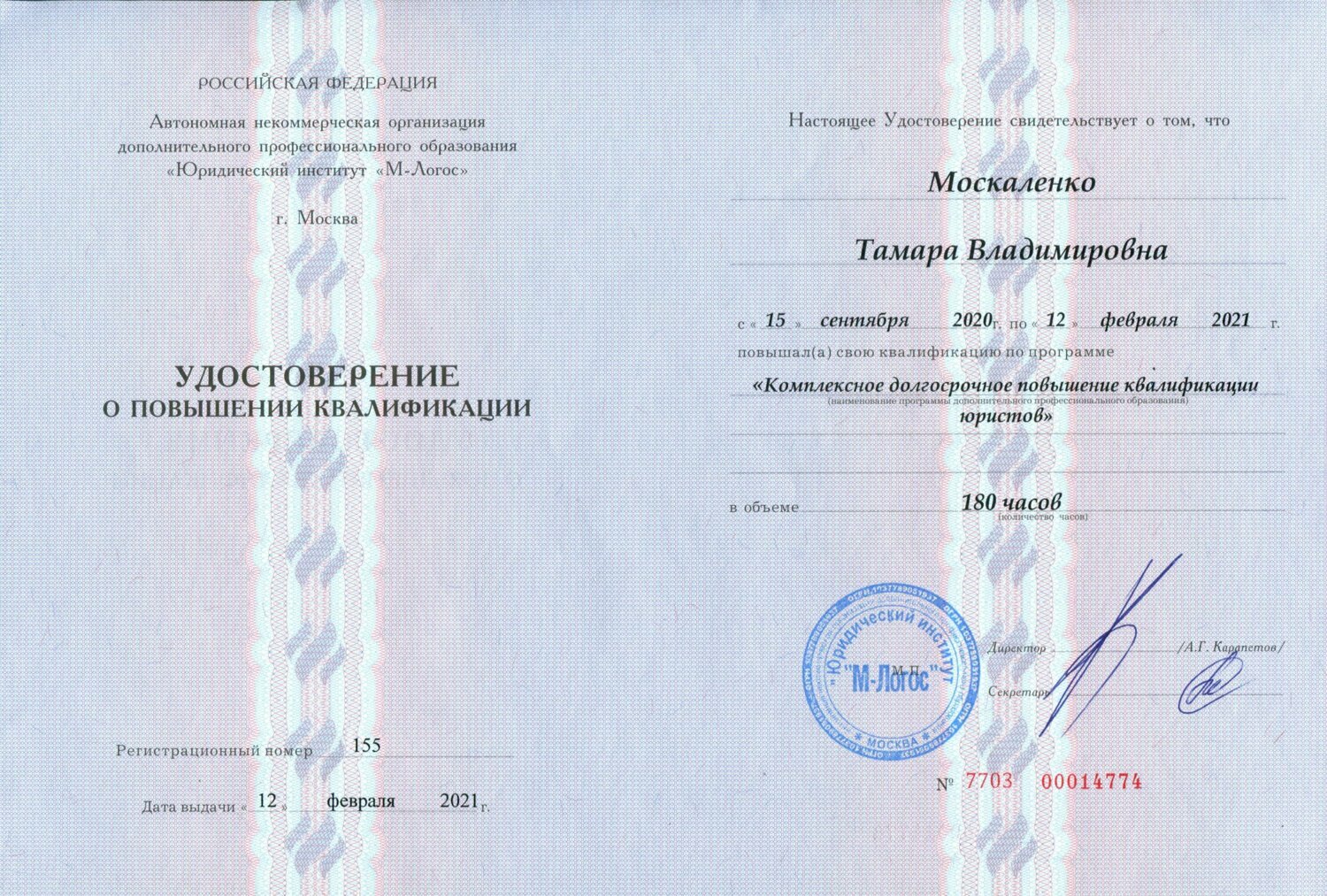 Образование: высшее юридическое, 1998 г. РУК (бывший Московский университет потребительской кооперации), 2021г. «Юридический Институт «М-Логос» г.Москва – Комплексное долгосрочное повышение квалификации юристов. Сегмент недвижимости: жилая городская и загородная недвижимость Москвы и Московской области Довольные клиенты: Более 20 лет успешно решаю жилищные вопросы клиентов, в том числе запутанные, сложные, спорные, тупиковые, конфликтные. Создаю уникальный код продажи для каждого клиента индивидуально, а это максимальная рыночная цена, устойчивый спрос на недвижимость, конкретные сроки продажи и четкий план действий. А также консультирую по юридическим вопросам, связанным с недвижимостью. https://vk.com/tamara_moskalenko