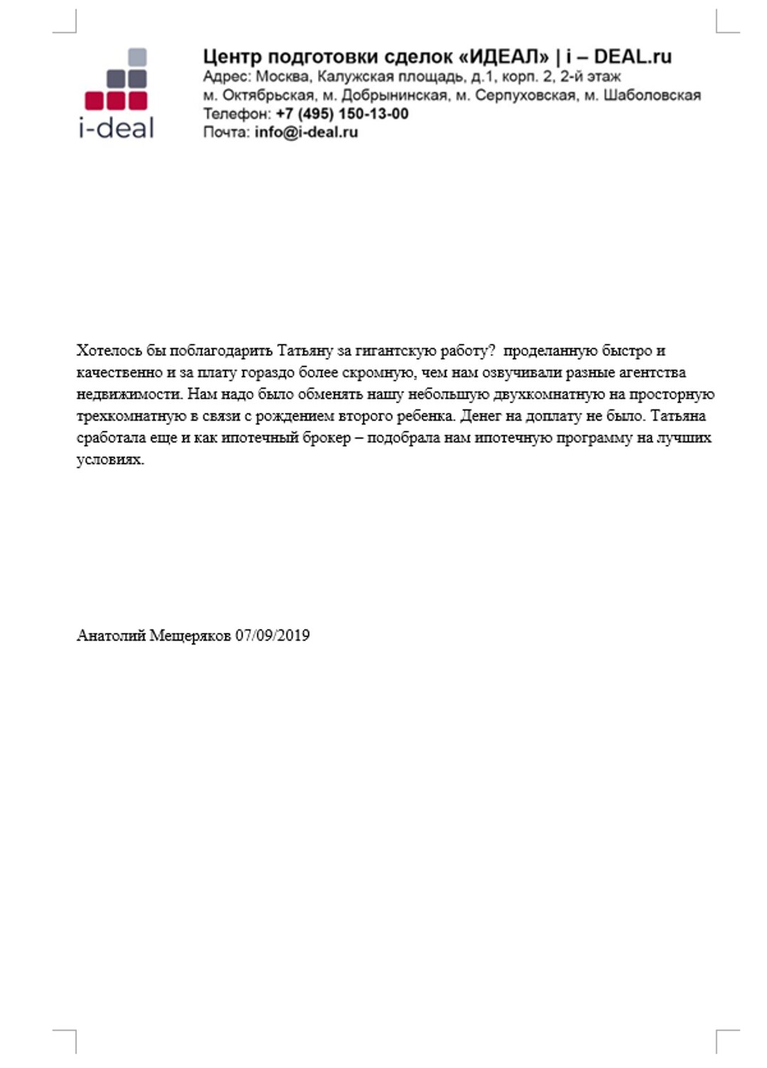 На Сайтах i-deal.ru применяется технология сбора информации с использованием cookie-файлов, которая позволяет повысить эффективность Сайтов и Сервисов i-deal.ru. Сookie-файлы - это небольшие текстовые файлы, размещаемые на пользовательском устройстве веб-сайтами, которые посещались пользователем. Они широко используются для того, чтобы веб-сайты могли работать эффективнее, а также, чтобы предоставлять необходимую информацию владельцам, администрации веб-сайта. Использование cookie-файлов - стандартная на данный момент практика для большинства веб-сайтов. Посещая Сайты i-deal.ru пользователь соглашается с условиями использования cookie-файлов, описанными в настоящем документе, в том числе с тем, что i-deal.ru может использовать cookie-файлы и иные данные для их последующей обработки, а также может передавать их третьим лицам для проведения исследований и предоставления услуг Партнерами i-deal.ru.